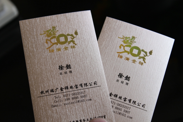燙印效果華貴典雅,讓您的名片熠熠生輝,氣度非凡,燙印顏色包括金、銀、藍(lán)、黑、紅等加工價(jià)格依燙金面積大小而定,如果燙金的面積小于名片單面總面積的1/3,則每面每盒的加工價(jià)格為10元;如果大于單面總面積的1/3,則每面每盒的加工價(jià)格為20元。另加**次制版費(fèi)15-20元。送貨時(shí)間3-5個(gè)工作日。